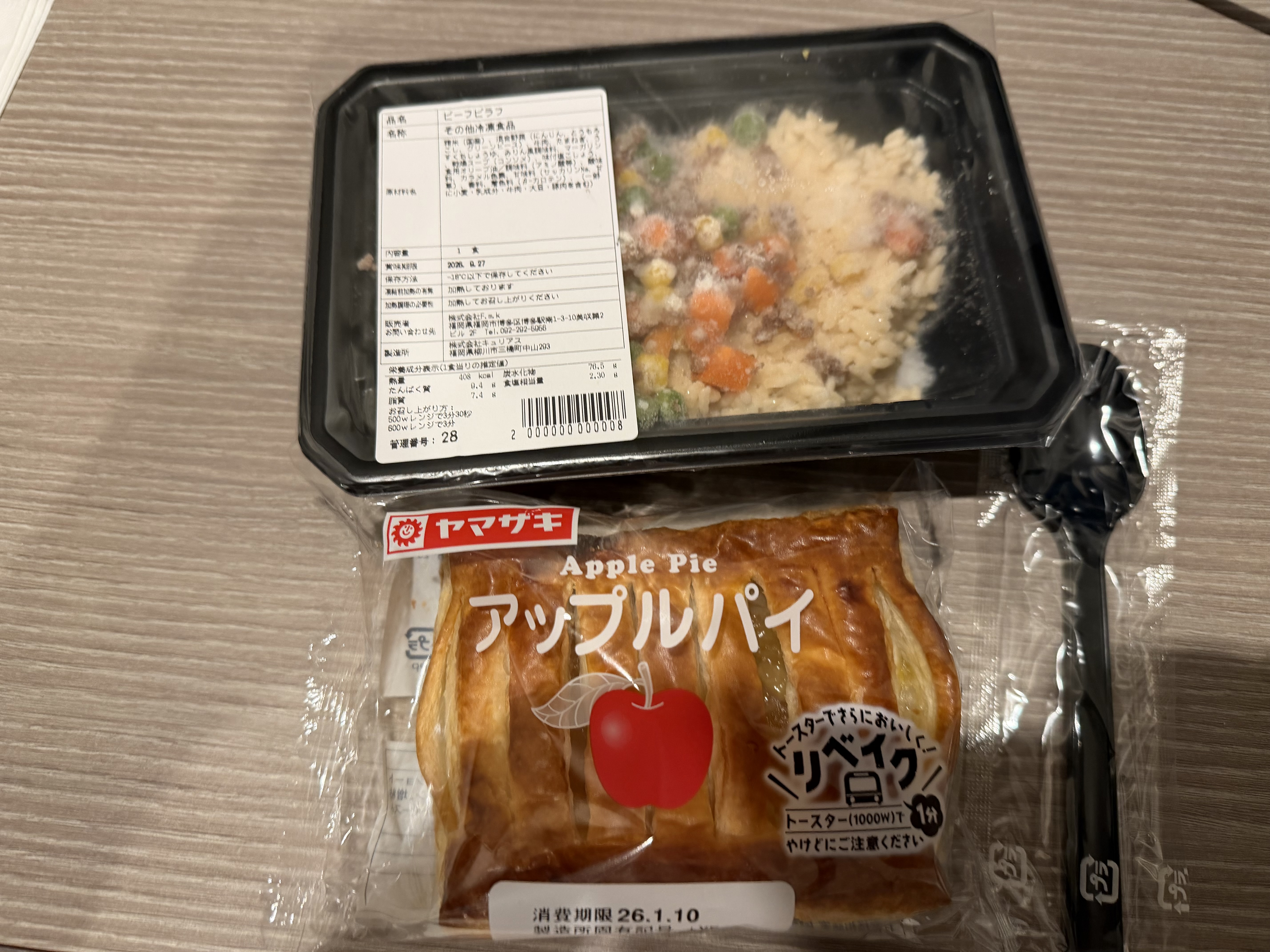 今日の朝ご飯は、昨日いただいた宿の冷凍食品のビーフピラフとスーパーで買っていたアップルパイとします